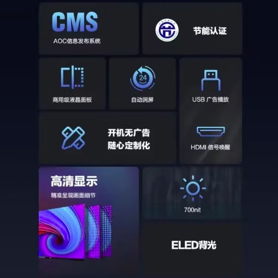【中关村在线北京行情】近日,AOC 55AE1HW 专业高亮数字标牌广告机在中关村在线商家“北京盛世雨田贸易有限公司”特价,详情请咨询商家联系电话:15210622147。AOC 55AE1HW 广告机凭借出色的显示性能与灵活特性,成为多场景信息传播的理想载体。其具备 700nits 高亮显示能力,即使在光线复杂的户外或明亮的室内环境下,画面依然清晰明亮,有效吸引观众目光,确保广告内容或信息展示无死角。搭载 4K 超高清分辨率,能够细腻呈现画面细节,无论是人物表情、产品纹理,还是文字信息,都能精准还原,带来极具冲击力的视觉体验。支持横竖屏自由切换与壁挂安装方式,可根据实际场景需求灵活调整展示方向,适配多样化空间布局;内置多种主流接口,方便连接各类播放设备,实现内容的快速传输与展示。同时,设备具备长时间稳定运行能力,支持 7×24 小时不间断工作,减少因设备故障导致的展示中断问题;还拥有智能远程管理功能,便于集中控制与内容更新,提升管理效率。